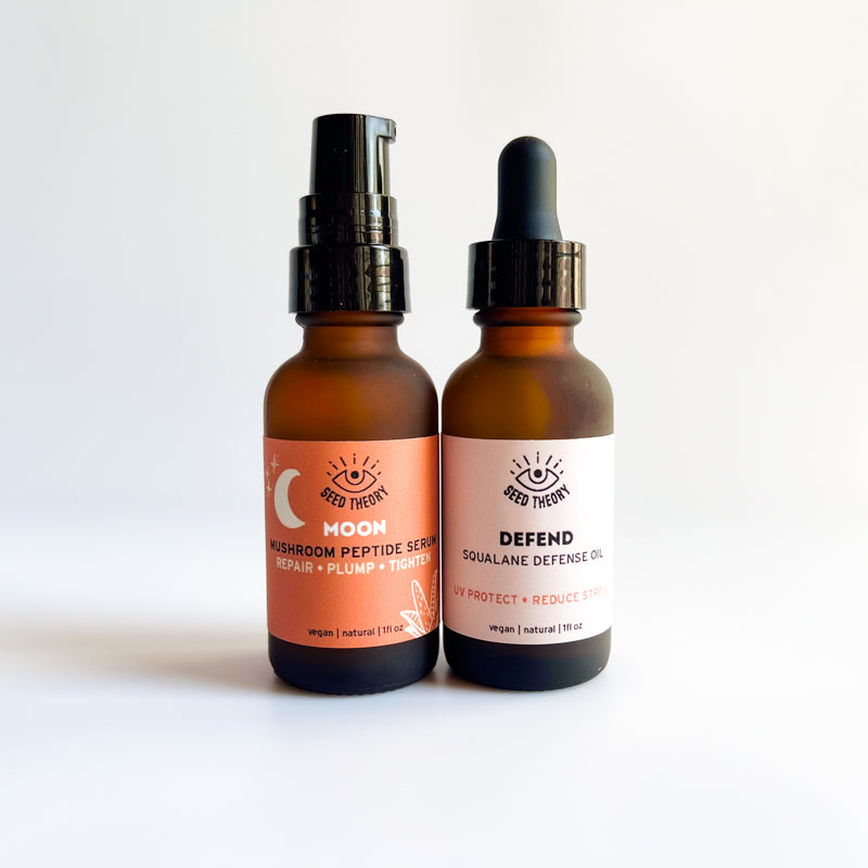 Save with our overnight bundle, and start your easy two-step skincare routine. Bundle includes Defend Squalane Defense Oil, and Moon Mushroom Peptide Seum